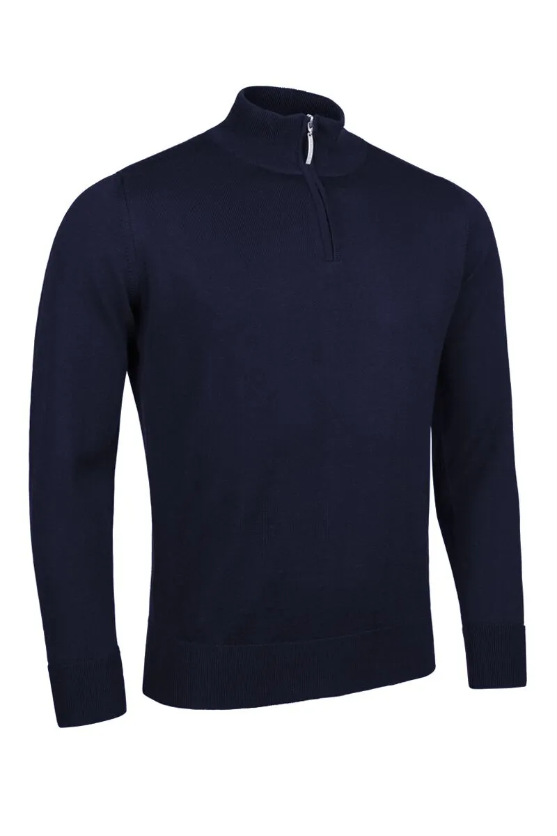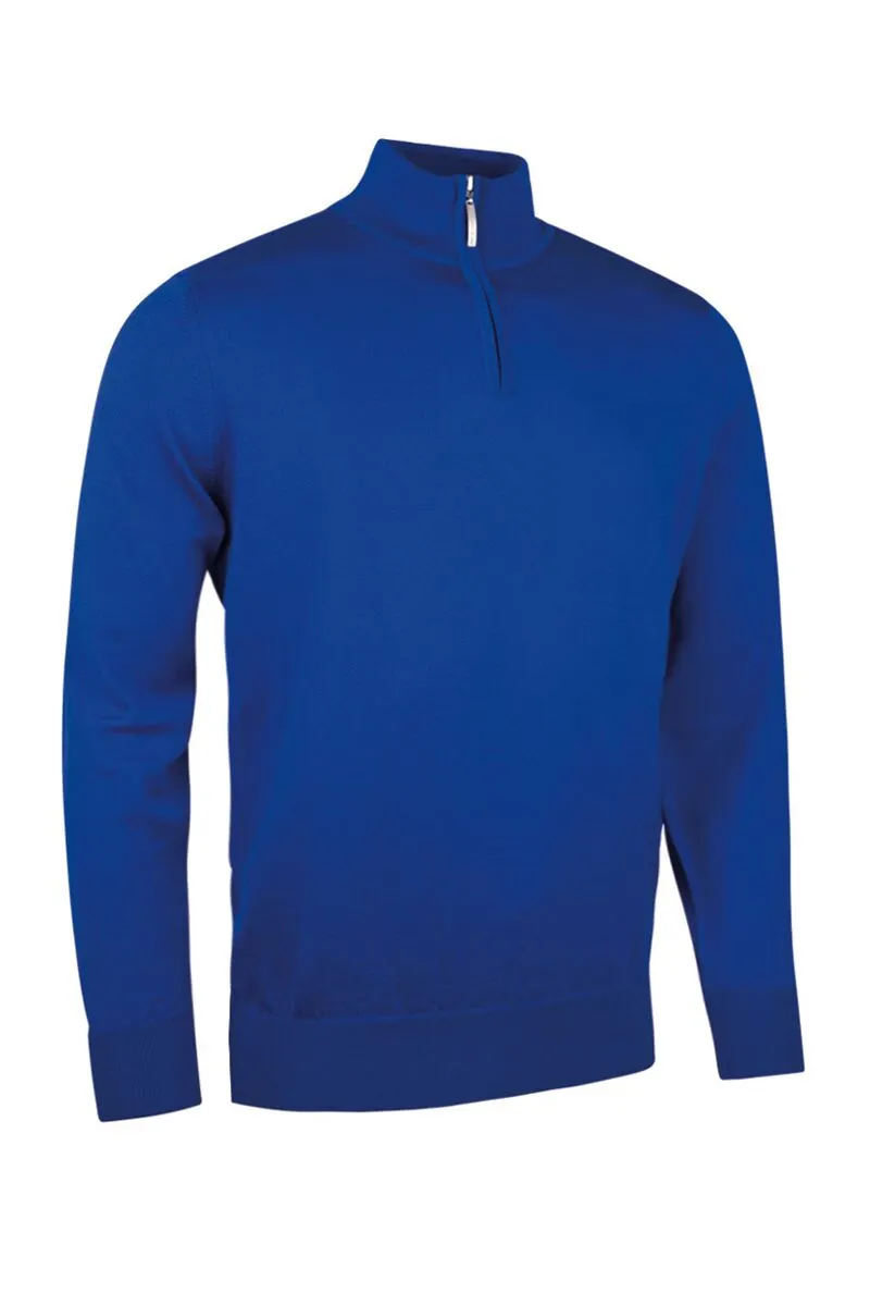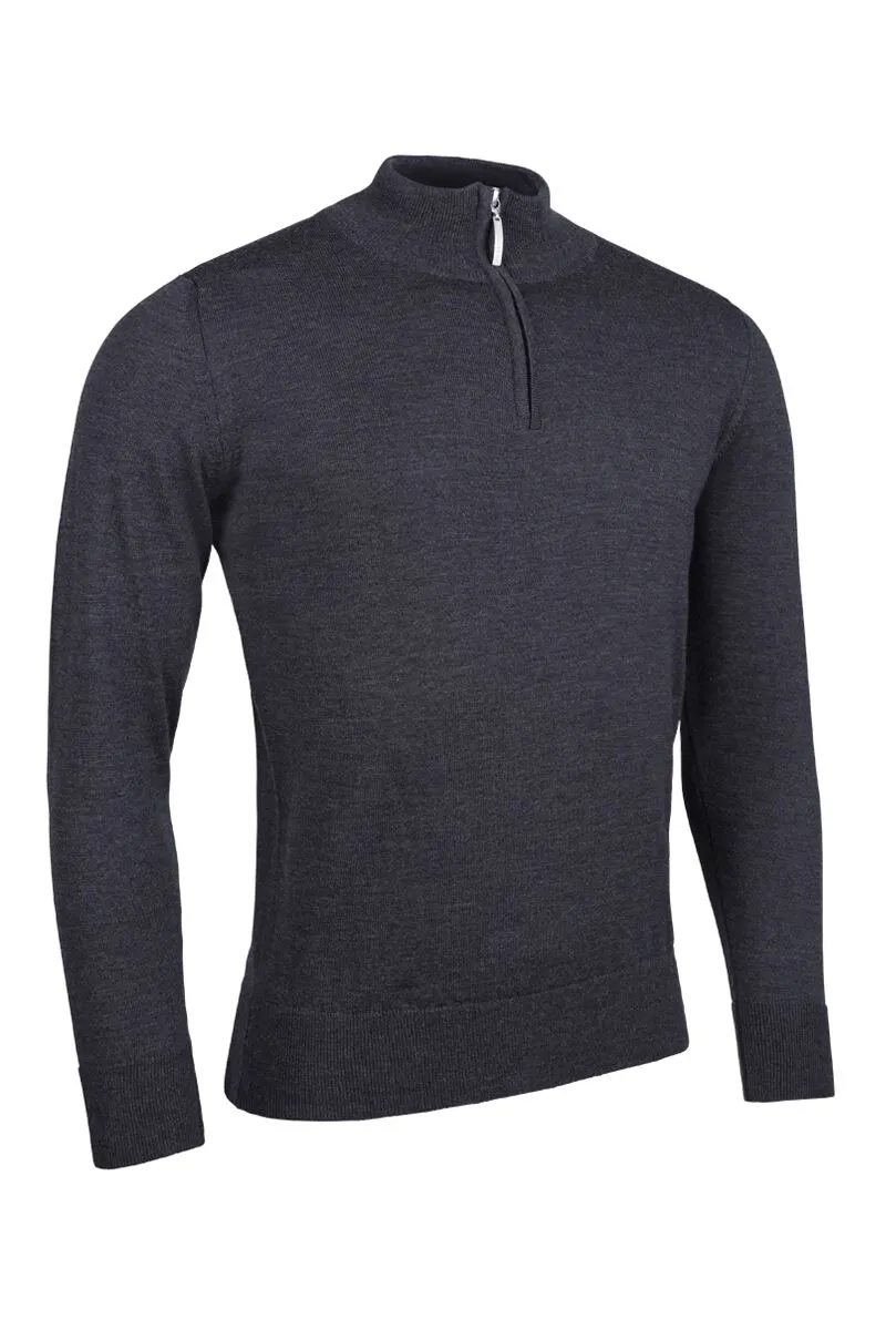 50% merino wool and 50% acrylic lined zip neck sweater.